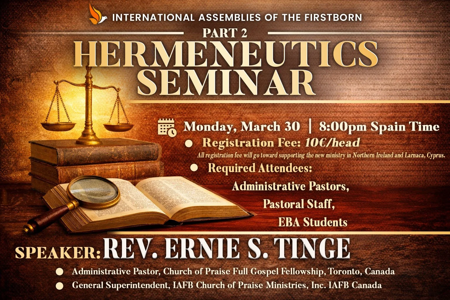 The International Assemblies of the Firstborn (IAFB) invites you to participate in Part 2 of the Hermeneutics Seminar, a continuing learning opportunity designed to deepen our understanding of biblical interpretation and strengthen our ability to faithfully handle the Word of God.